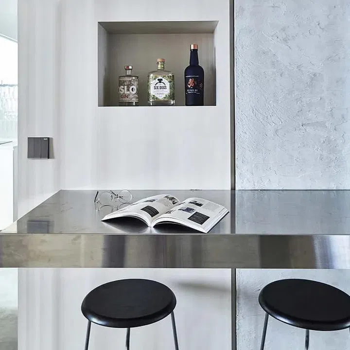 A structural column sits right smack in the middle of the flat. While others may have chosen to cover it up, Rei decided to make it the centrepiece of the flat instead, building everything around it. The TV feature wall, for instance, was built on one side, with a cast concrete dining table on the other to make it look like a natural extension of the column. Behind is the couple’s bar and a niche for storing their liquor, as they love hosting gatherings. The bar is in stainless steel for a more urban, edgy look. “The use of different materials also helps to create different zones,” says Rei.