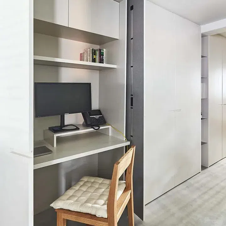 Storage was high on the list of priorities, as the flat didn’t have a household shelter and the bedroom was too small to have a proper wardrobe. Rei resolved this by building full-height cabinets down the length of one wall, ensuring they were 60-70cm deep for sufficient storage. Part of the cabinets forms the couple’s wardrobe, while another part slides open to reveal a hidden work station. The rest are for keeping the usual household bric-a-brac out of sight.