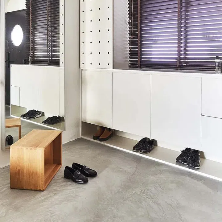 Even the front door is free of visual distractions, thanks to the lack of a gate, and a large fluted-glass porthole in place of the usual peephole and doorbell combination. According to Rei, the couple feels safe enough to do this as Jody knows the neighbourhood well.