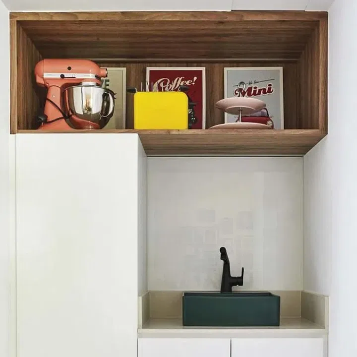Part of the wall enclosing the kitchen toilet was also demolished to enlarge the area. Replacing the toilet is a small store room, a sink and some built-in cabinets.