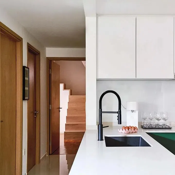 Finished predominantly in white against a white-washed wall, the minimalist colour palette extends to the rest of the apartment, differentiating them from the kitchen space.