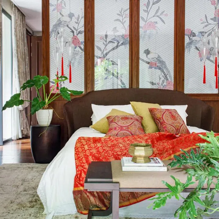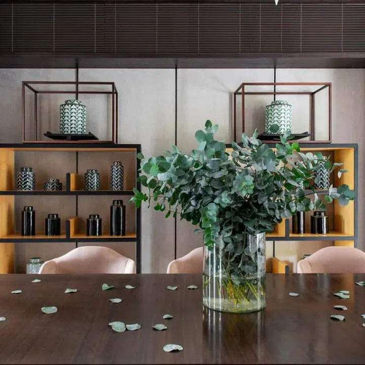 The screen is an homage to Chinese heritage. Plants and dark solid wood create a stately yet cosy ambience.