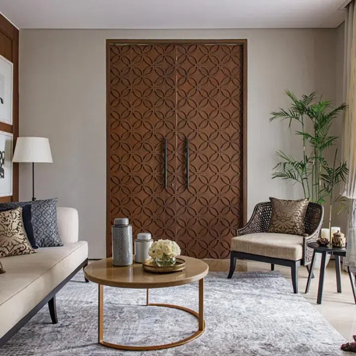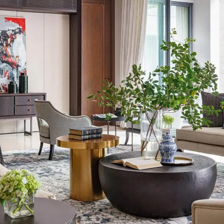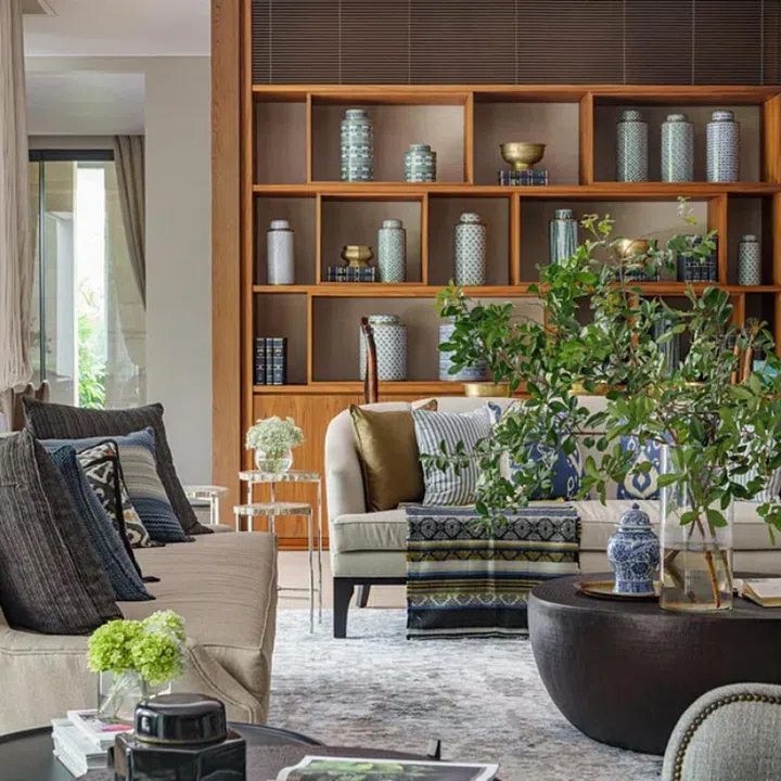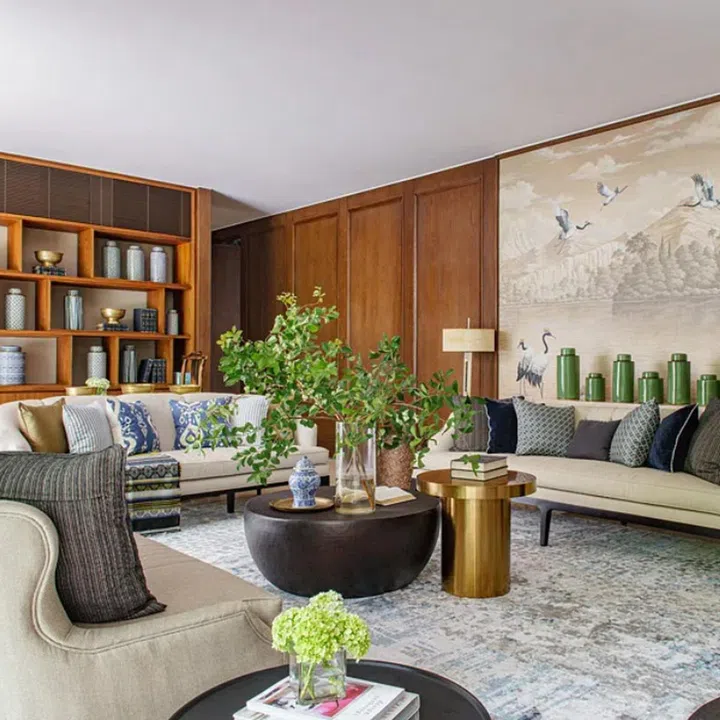 The furniture pieces are carefully curated, creating an opulent yet relaxed look.