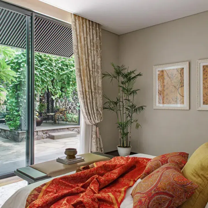The bedroom enjoys ample natural light and direct connection to the greenery outside.