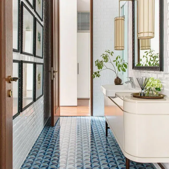 Framed illustrations, glossy white tiles, plants and patterned tiles create a contemporary look with retro feel.