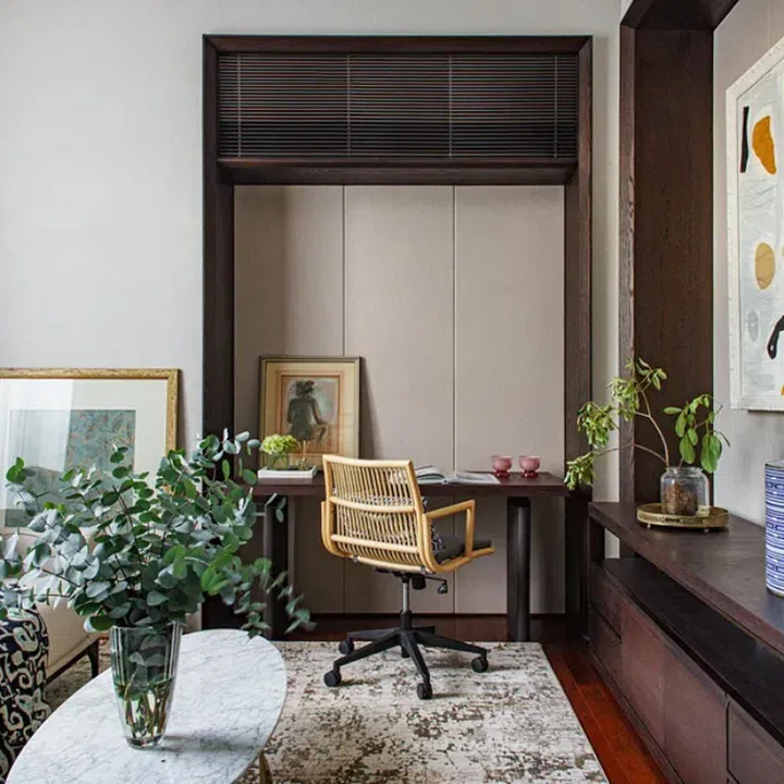This study area features rattan task chair and abstract rug that soften the clean cut aesthetic of the architecture.