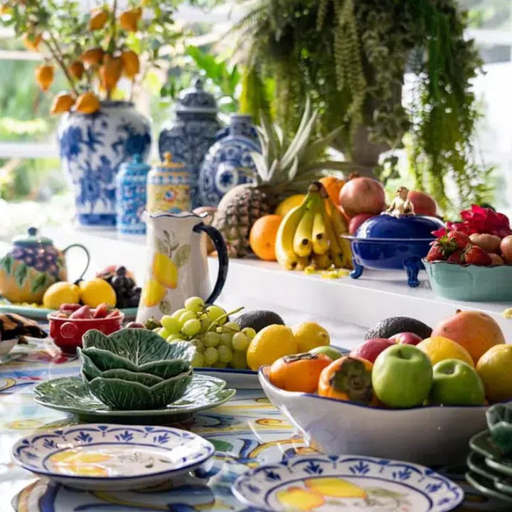 Drawing on motifs and colours from the wall mural, the dining table top seems to pull the scene right out of the wall. It elevates dining into an immersive experience that feels as if it is taking place inside a classic walled garden.
