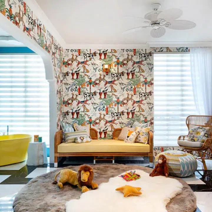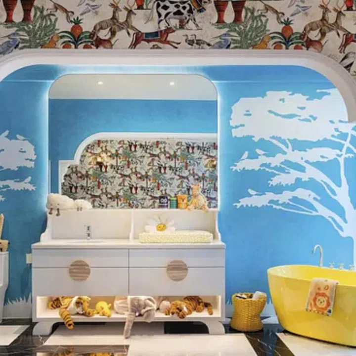 The nursery takes us on an African safari. The wallpaper features animals from the continent.