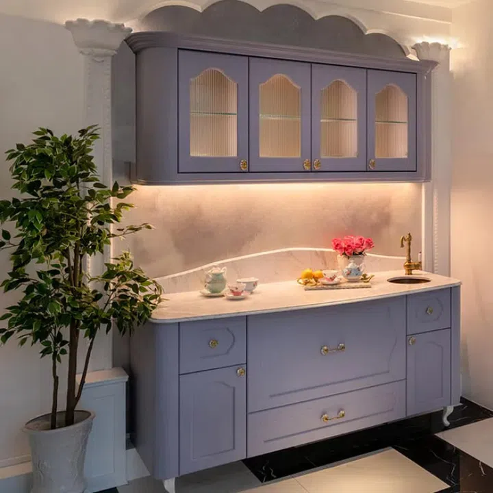Located at the staircase landing, the pantry nook precedes the master bedroom. The pantry unit looks like something out of Bridgerton, encapsulating the romance and delicate lines.