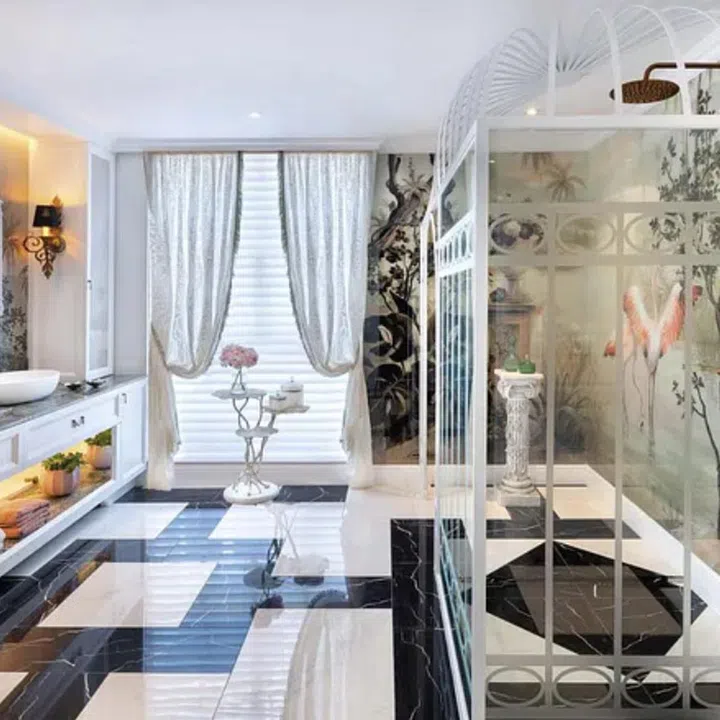 A whimsical shower enclosure in the form of a decorative bird cage takes the mundane out of a daily ritual.