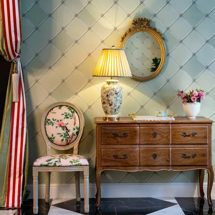 The pistachio and apricot colour palette is classically French, complemented by wallcoverings, furnishings and accessories that create a romantic, relaxed, and quietly glamorous ambience.