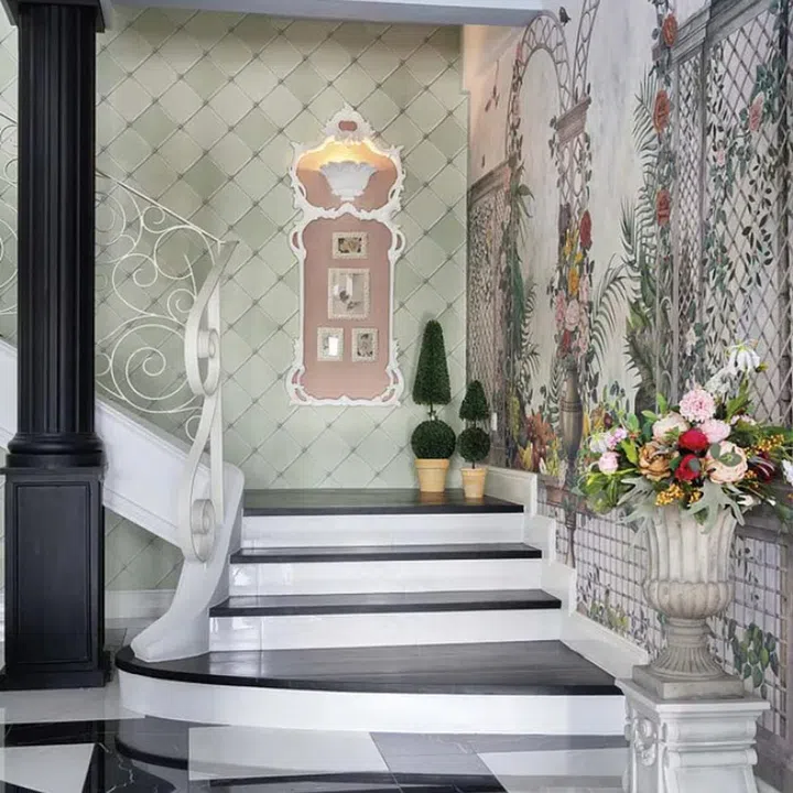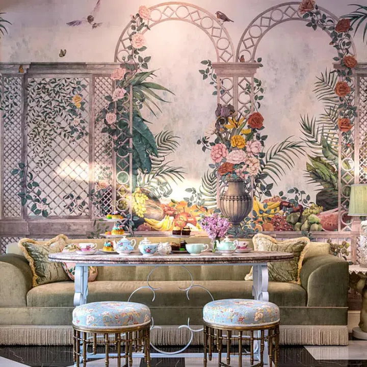 They depict enchanting columns and trellis adorned with beautiful trailing flowers, luscious fruits and birds that convey a romantic period setting right from the moment one enters the home.