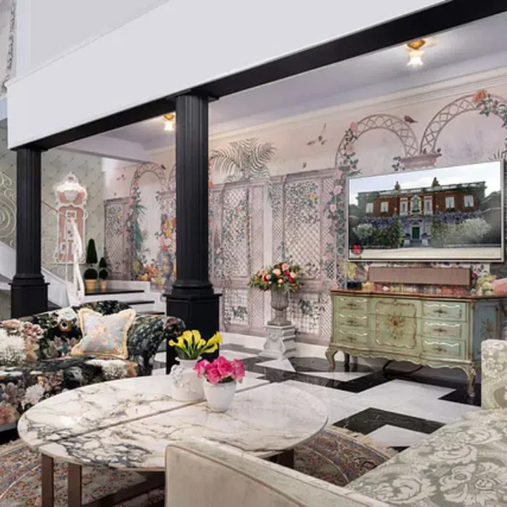 Floor-to-ceiling wallpaper murals flank the living and dining areas on the first storey.