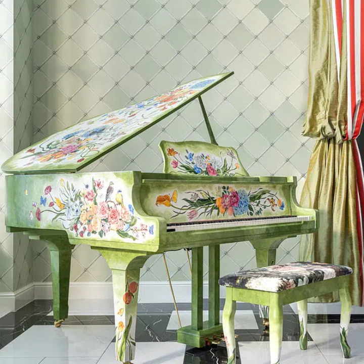 Taking pride of place in one corner of the living room adjacent to the pool terrace is a bespoke grand piano specially commissioned for the home.