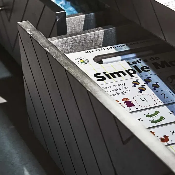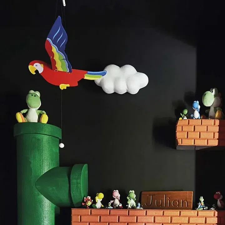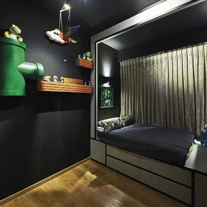 Each “level” on the wall provides storage space for their child’s toy and figurine collection. Like the living room, the bed is elevated on a platform, with plenty of room for clothes, books, and other necessities.