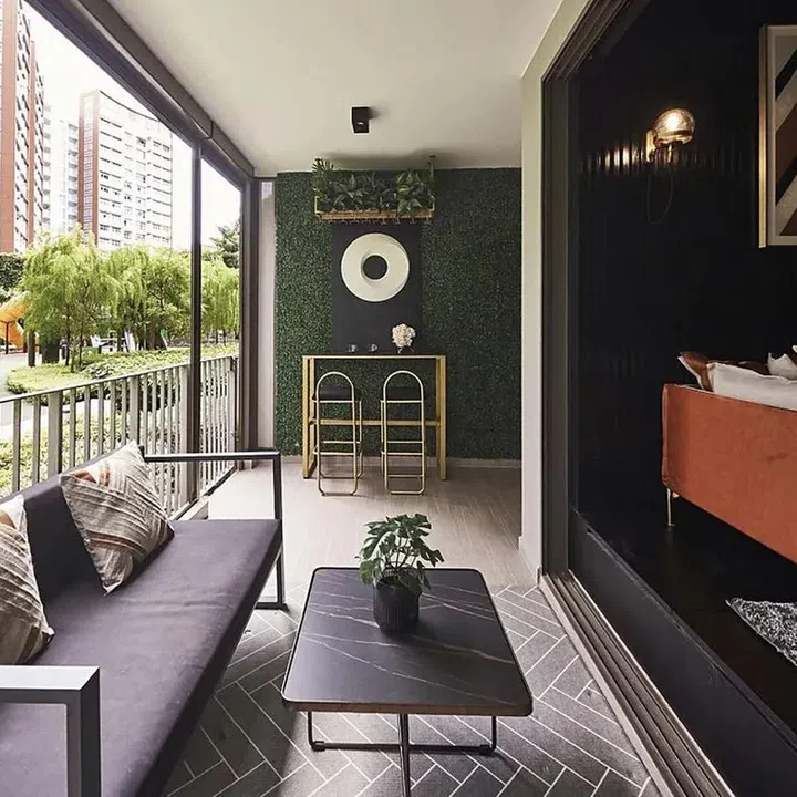 The little touches need not be expensive, as long as you know where to put them. The green wall in the balcony, for instance, is astroturf that has been nailed to the wall. Carmen also elevated the look of the shoe cabinet in the entryway by adding non-weight-bearing gold legs to the bottom. The attention to detail is what makes the home feel luxurious. “It’s the little things that make a difference,” says Carmen.