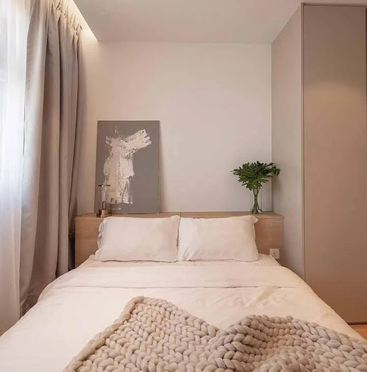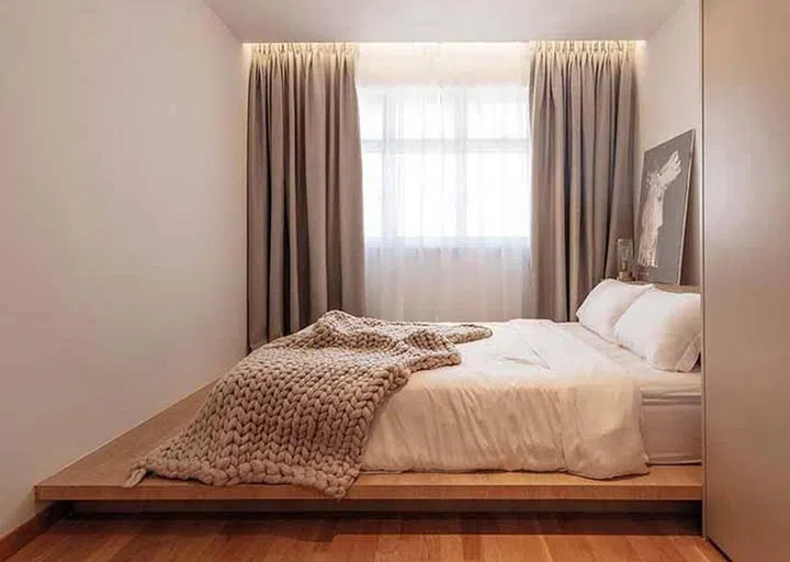 The master bedroom is a minimalist’s haven, featuring bare walls, a wardrobe and a mattress sitting on an elevated platform. Shinghui shares a design tip: “A platform bed is a good way to make the bedroom feel a little more spacious. The bed is often the largest item in the bedroom – lowering its position can help make the space feel less cluttered.”
