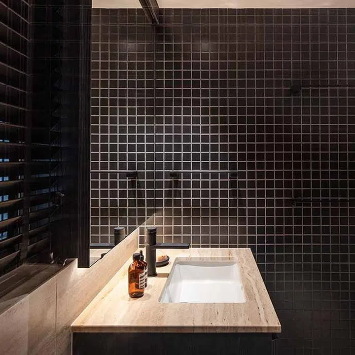 Meanwhile, the black and khaki mosaic tiles lend a cool graphic touch in the bathrooms.