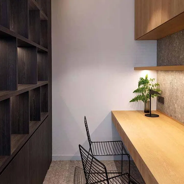 It is separated from the communal spaces by a full-height storage wall finished in charcoal timber laminate with open shelves that allow for visual connections while providing enough privacy to study and work.