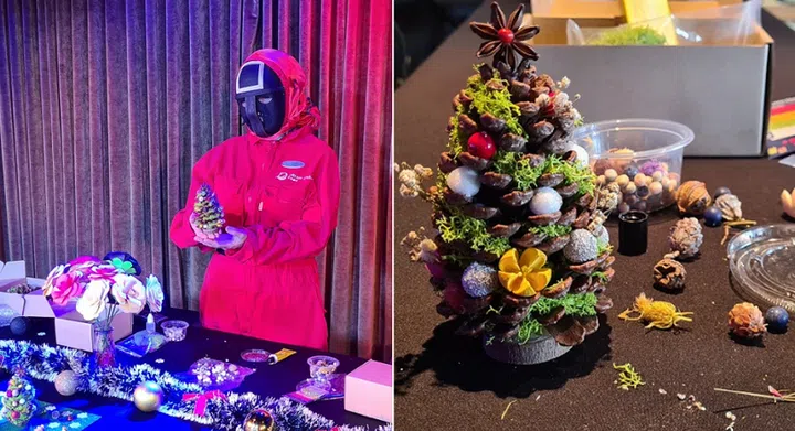 We got to make our own mini Xmas tree using pine cones decorated with natural materials — and all while supervised by masked guards from hit K-drama Squid Game.