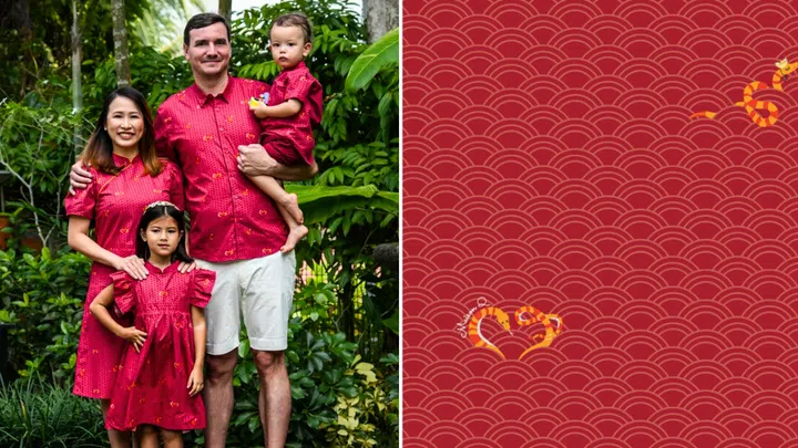 Get everyone dressed in Maison Q's “Charismatic Mr Snake” print — a discreet snake motif set against a crimson backdrop — for the occasion that's available across various designs for both dad, mum and the kiddos. Think cheongsams, onesies, shirts and shorts. Even better, options for the little ones (aged one to seven) are reversible, with the “Charismatic Mr Snake” print on side, and a “Mandarin Jamboree” carnival print on the other. Both designs are available for adult outfits, though these aren’t reversible.