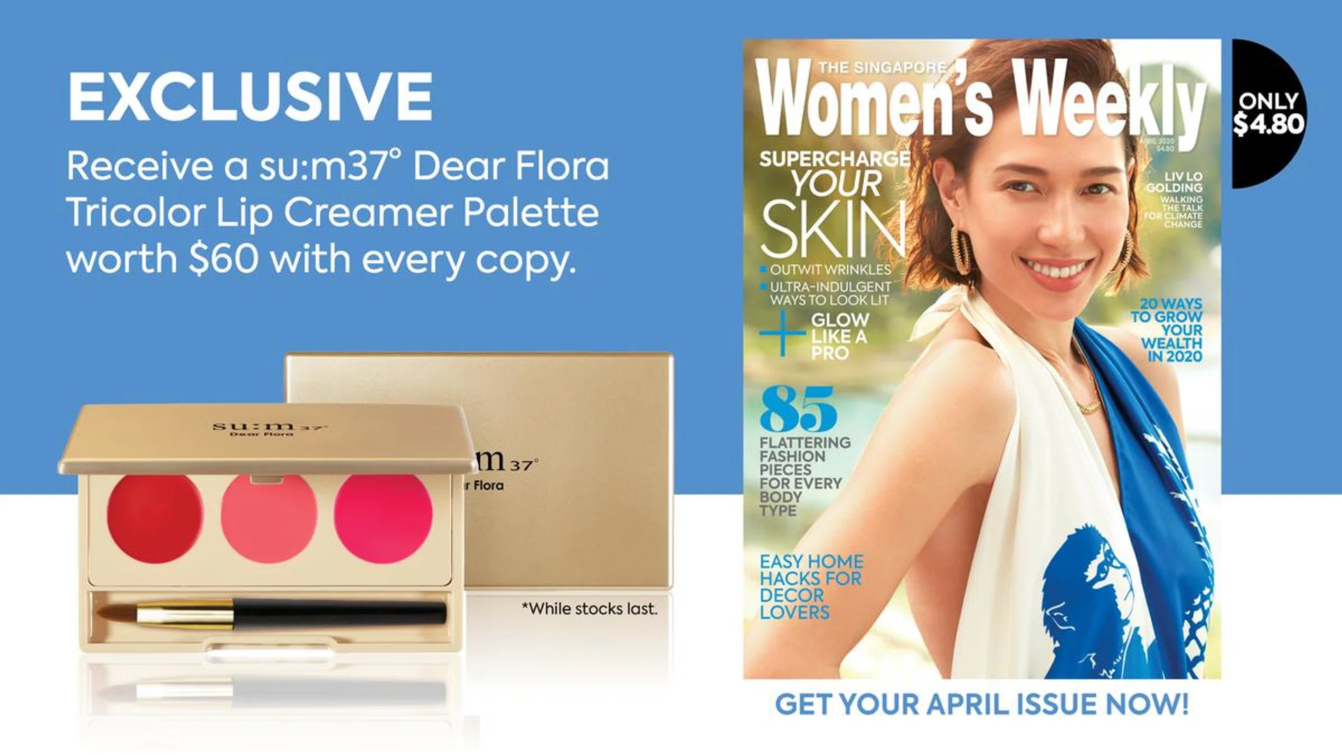 Grab a copy of The Singapore Women’s Weekly April Issue at any Kinokuniya outlets now and receive a su:m37° Dear Flora Tricolor Lip Creamer Palette, worth $60 *.