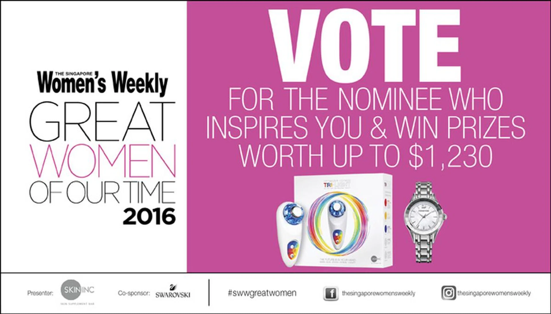 Vote for the nominee that inspires you and stand to win a gift set comprising of Skin Inc Optimizer Voyage Tri-Light and Get Perfect Set worth $530 and a Swarovski Alegria STS/MOP/STS worth $700!
