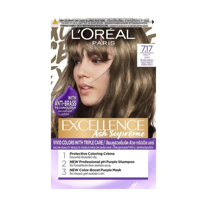 Those looking to impart trendy ash hues into their hair can look to L'Oreal's Ash Supreme line. Created for dark Asian hair, the Triple Care Formula works synergistically with Purple Anti-Brass and Color Boost technologies to make ashy shades such as Matt Ash and Lavender Ash pop.