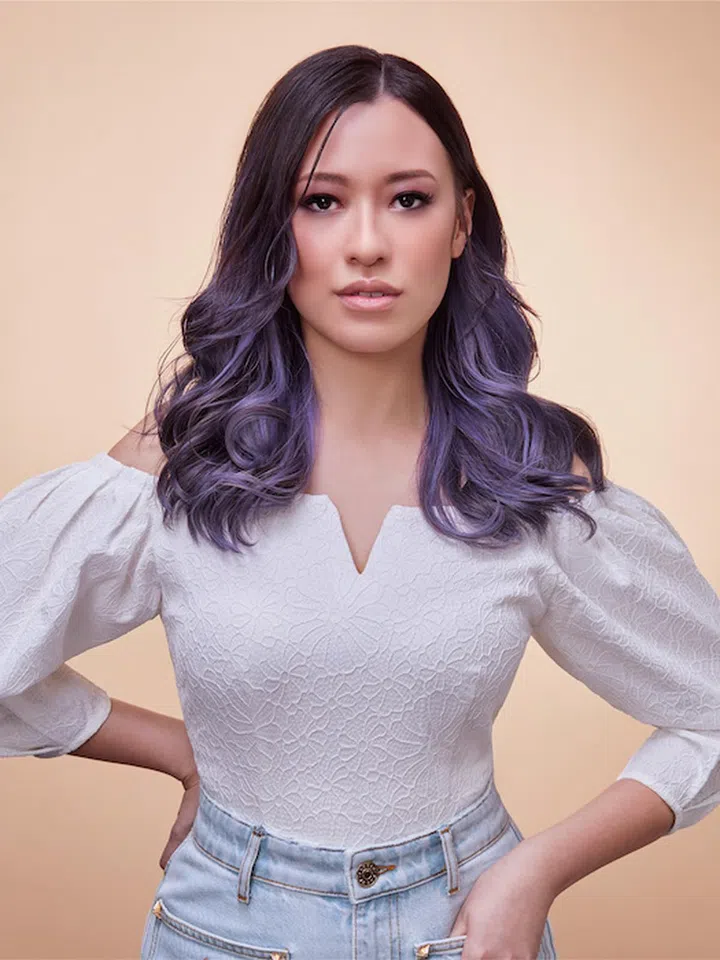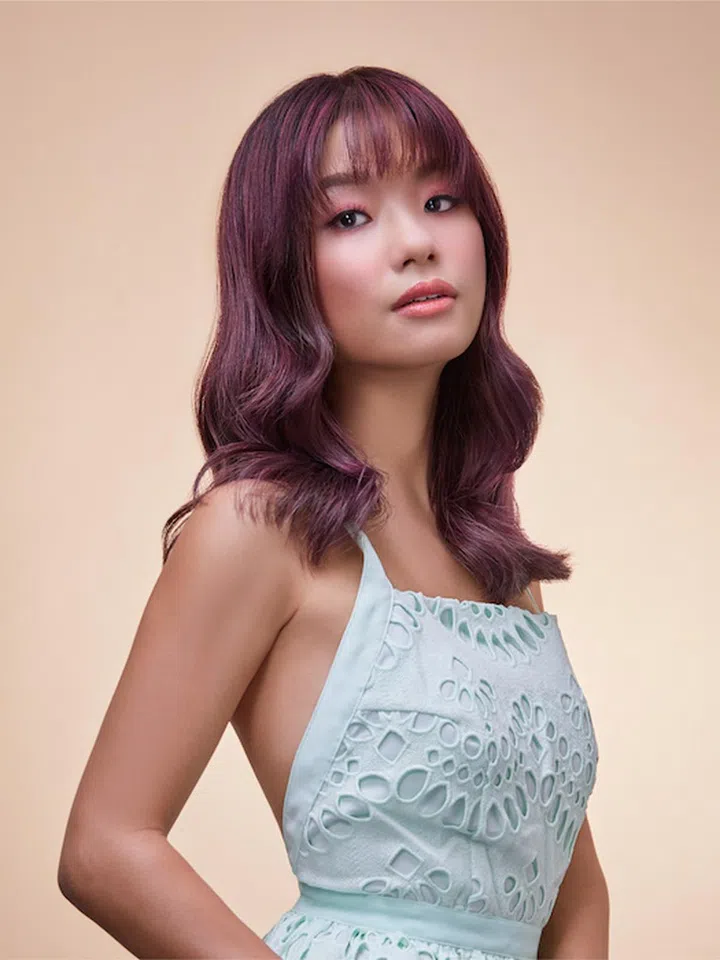 The Iris Violet here creates a gentle, feminine impression with its ashy quality through face-framing highlights which give an elegant contrast.