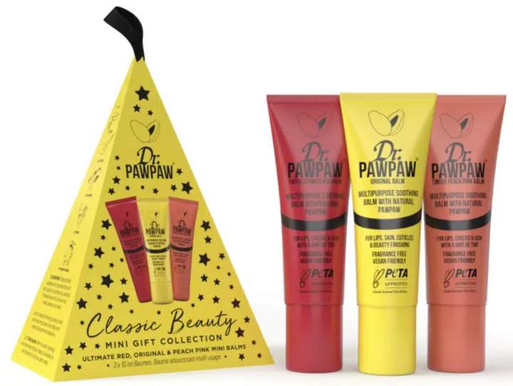 If you know someone who always has chapped lips, getting them some tinted lip balm might perk them up. Dr. PAWPAW's Christmas Gift Set comes with three travel-sized lip balms in the shades Original, Peach Pink Lip Balm, and Ultimate Red Balm. They are all buildable from a soft sheer to a bold colour.