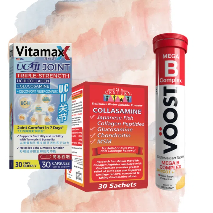21st Century Collasamine Sachets ($28.85 for 30s) offer relief for joint pain and cartilage renewal. The water-soluble powder contains collagen peptides, glucosamine, chondroitin and MSM, and comes in a delicious orange flavour with no fishy taste or smell.