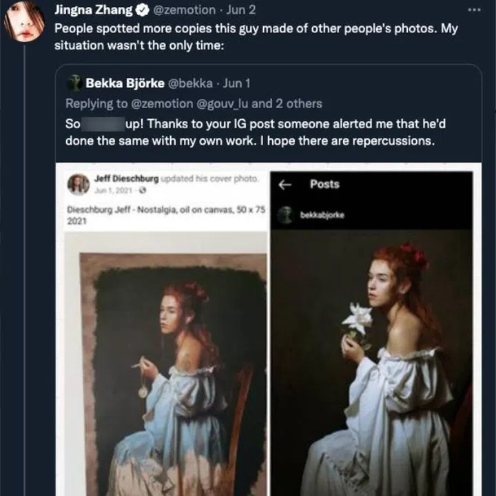 Zhang later shared how Dieschburg had similarly used the work of another photographer, Bekka Bjorke, without permission.