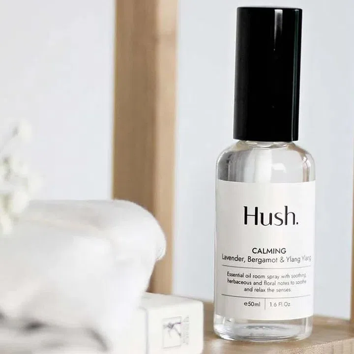 Exposure to smells associated with calmness and relaxation may be beneficial in the lead- up to bedtime and through the night. An easy way to infuse your room with serene scents is with Hush Candle’s Calming Essential Oil room spray.