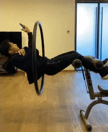 In case you're wondering, it's quite a physical feat as it involves one hooking their legs on a piece of fitness equipment then extending out the upper body horizontally and hula hooping.