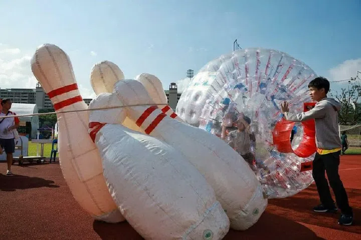 In Bedok, festivalgoers – mostly donning red and white – tried out sports like basketball and athletics, or experiential activities like zorbing, where a person climbs inside a large inflatable ball and rolls about.