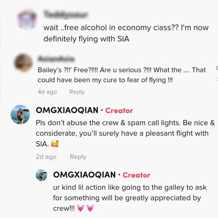 Sheau posted a two-part TikTok series on 'secrets' about her ex-company on 26 March and 28 March respectively. The first video about hidden drinks menu on SIA flights went viral, racking up over 30,000 likes and nearly 390 comments.