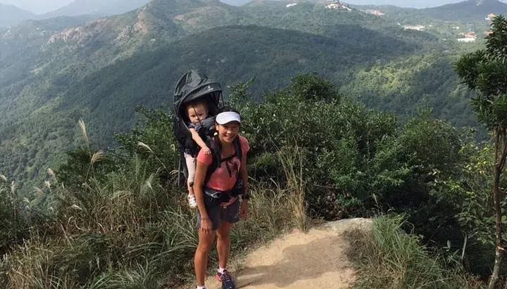 Caption: Jeanette hiking with Marla aged 17 months in Nov 2015 on Lantau Island – this is the route up to Lantau Peak, with the famous Big Buddha in the background