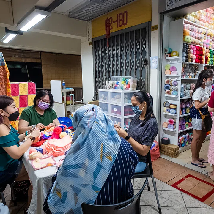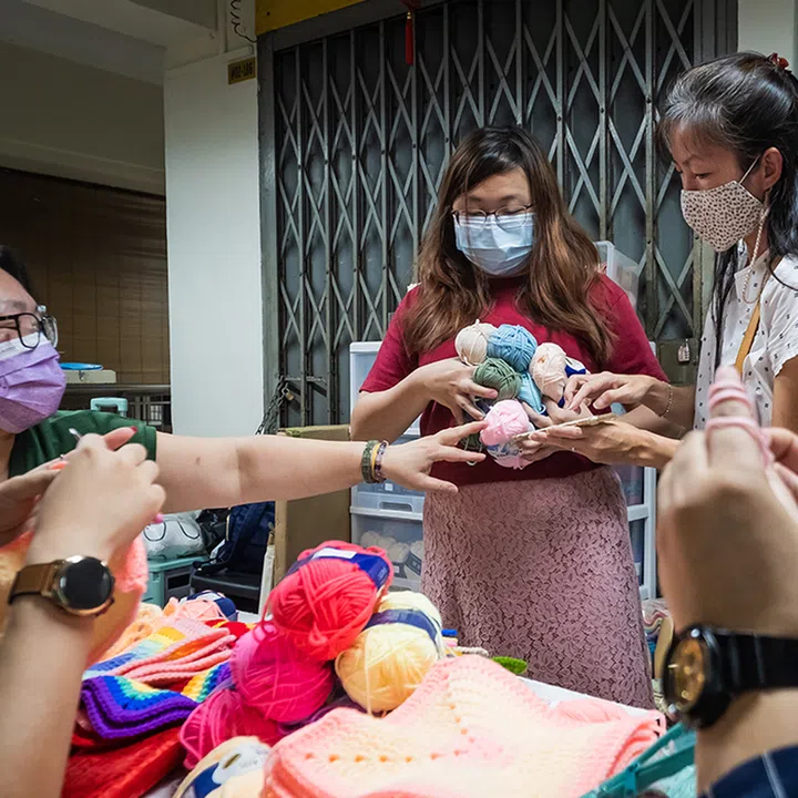 In a quiet corner of Golden Mile Food Centre, five friends are busy turning yarn into granny squares. These squares need to be exactly 20cm on each side – 54 squares are then joined together to create a blanket. Using milk cotton yarn, each square takes about one and a half hours to crochet. And making one blanket can take as long as 20 days.