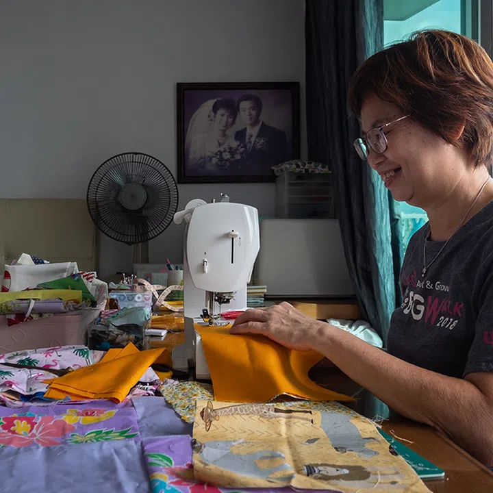 Madam Florence Leong also took time to sew pieces of squares together to make patchwork blankets.