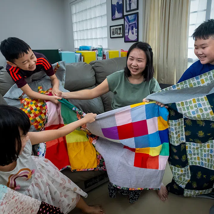 Madam Xie Yi Shan, 41, made four patchwork blankets, with help from her two sons (from left) Evan Sim, nine, Dylan Sim, 11, and daughter Shannon Sim, five.