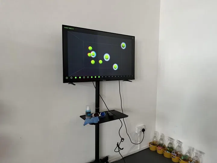 We took a break from the more physical activities and sat down in front of a screen. Yes, we sat down in front of a screen in a gym. Anna booted up the computer at the side and multiple tennis balls appeared, with four of them having a ring of light around them.