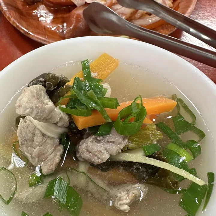 A simple soup made with little parcels of pork, carrot and salted mustard greens tied with dried gourd and layered with clams and generous piles of shredded ginger.