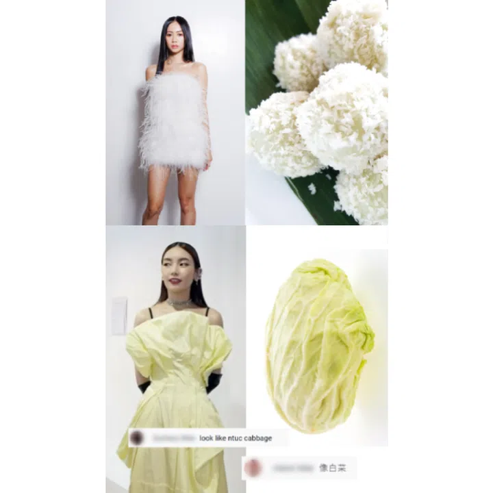 Bonnie Loo's get-up was said by some to resemble ondeh ondeh, while Sheryl Ang's dress looked like Chinese cabbage from some angles. And Chantalle Ng's bright red gown reminded one of chillies. Their outfits sparked several memes on the Mediacorp Channel 8 Facebook page.