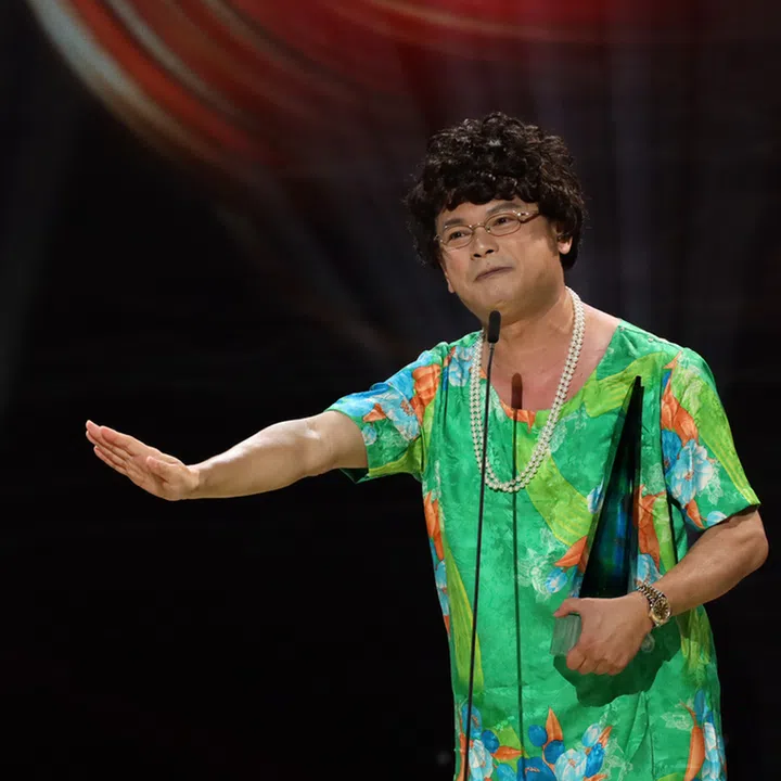 Towards the end of his acceptance speech, two staff walked onstage. Within seconds, Chew, with his back towards the audience, had turned into the colourful aunty character, complete with pearls and curly wig.