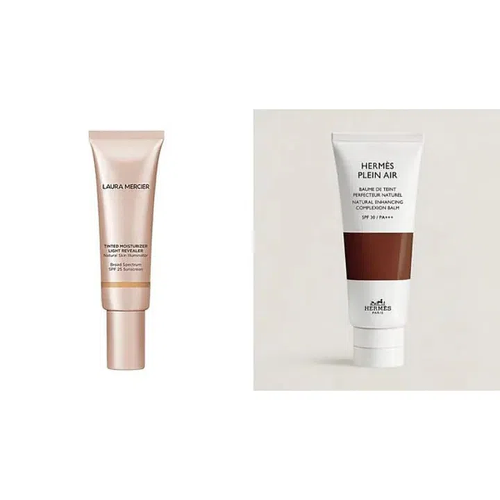 Apply Laura Mercier Tinted Moisturizer Light Revealer Natural Skin Illuminator ($79) or Hermes Plein Air Natural Enhancing Complexion Balm ($148). Lightly contour the face to achieve a no makeup, makeup look.