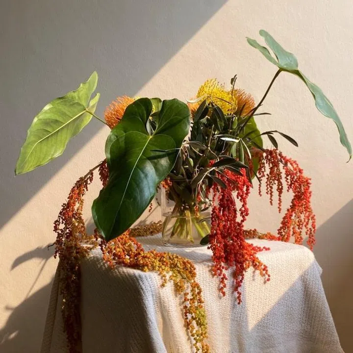 “Amaranthus is another favourite because of the drama it always brings to the scene. I like to play with structure and varying heights to give more depth. This one also featured pincushion protea and olive tree branches.”