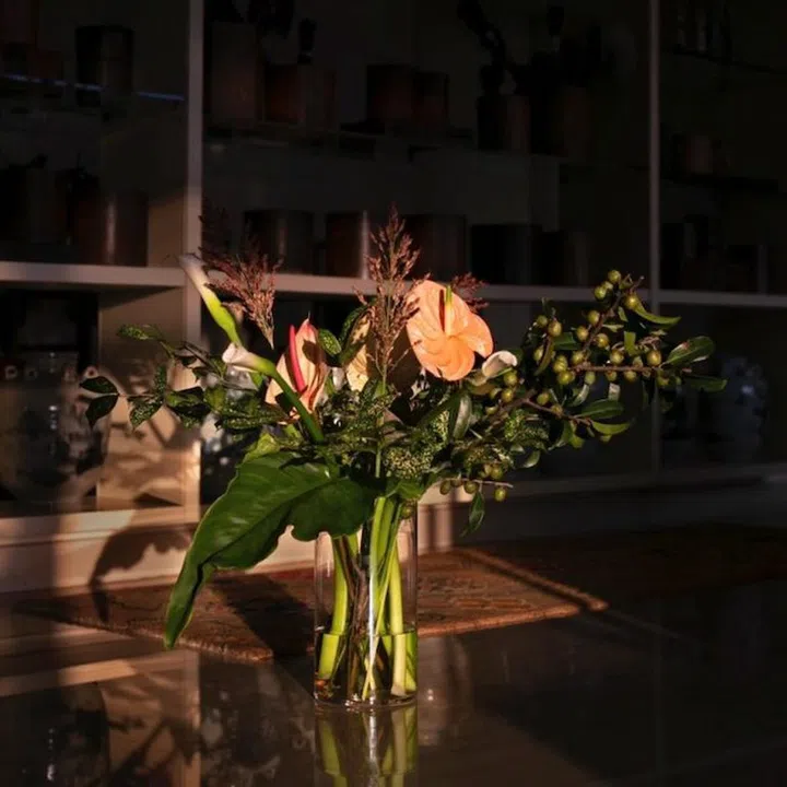 “One from the piccolini series. Minimalistic mini arrangements usually intended as statement centrepieces (often used by restaurants or other hospitality clients). The pigtail anthurium is so beautiful that it sits here on its own.”