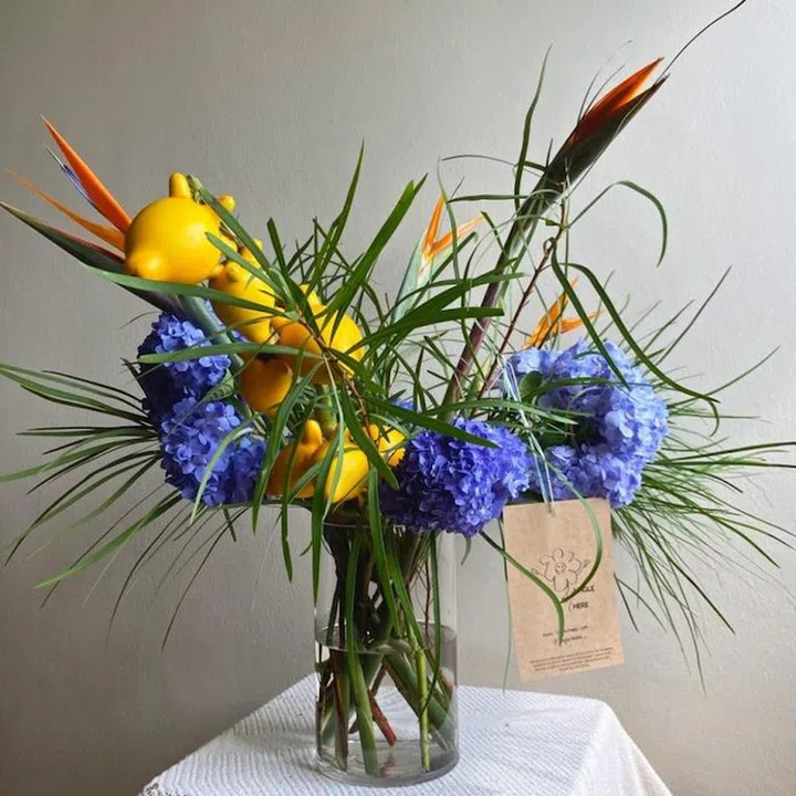 “I am obsessed with nipple fruit (also known as cow udders or Apple of Sodom). I combined it with smooth hydrangeas, birds of paradise and long thin leaves for a little fun and quirkiness.”