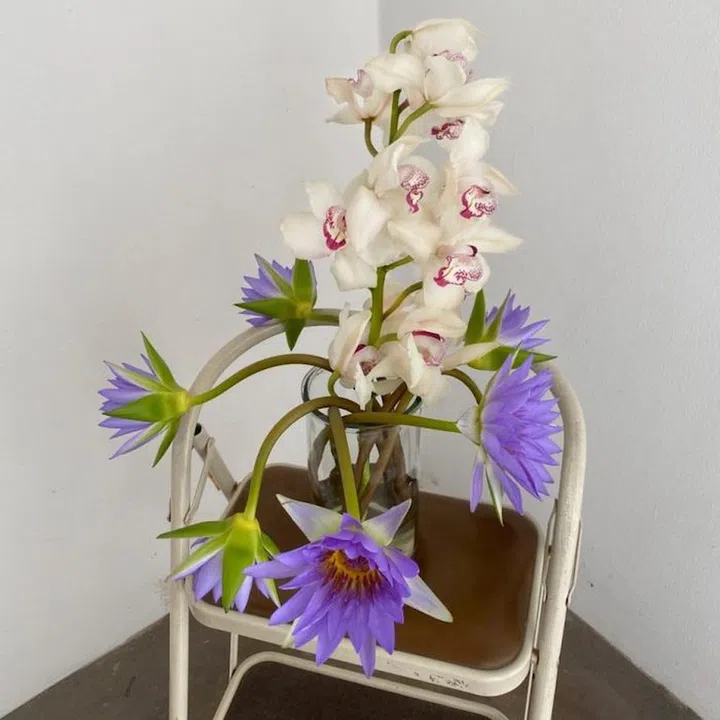 This was a very early arrangement that I made for myself at the height of chemotherapy. I love nymphaeaceae, more commonly known as water lilies, because of the special way they close and reopen. Their colour is so electric too.”