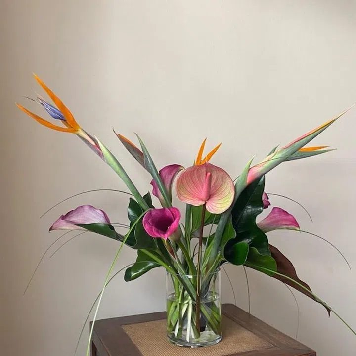 “This one was for one of my subscription clients, and is still one of my favourites. She has a long black dining table, so I always bring a little colour to the space through the flowers I choose. The dining room has a lot of linear lines so the roundness of the anthurium faces and tube like nature of the Cala lilies soften everything up. The bird of paradise protrude outwards to break an otherwise regular arrangement outline.”